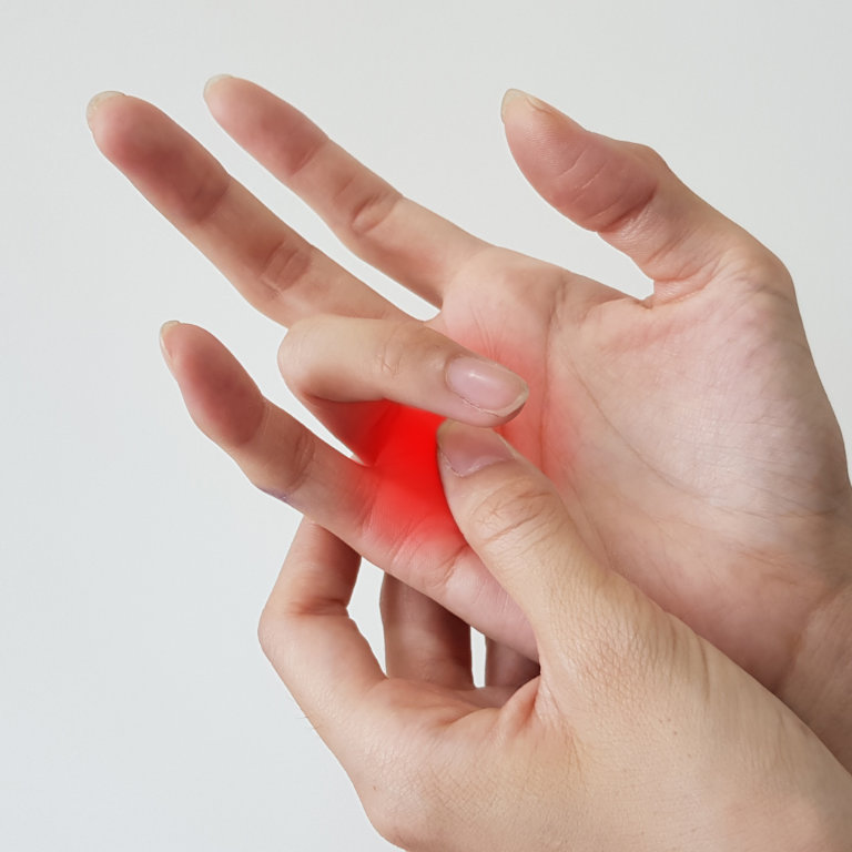 Terapia Manual: mobilizações articulares e libertação miofascial para melhorar o movimento do dedo e reduzir a rigidez.